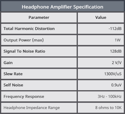 The headphone amp uses a current feedback architecture with a direct (non capacitive) connection to the headphones, for the lowest possible distortion and prefect frequency response.